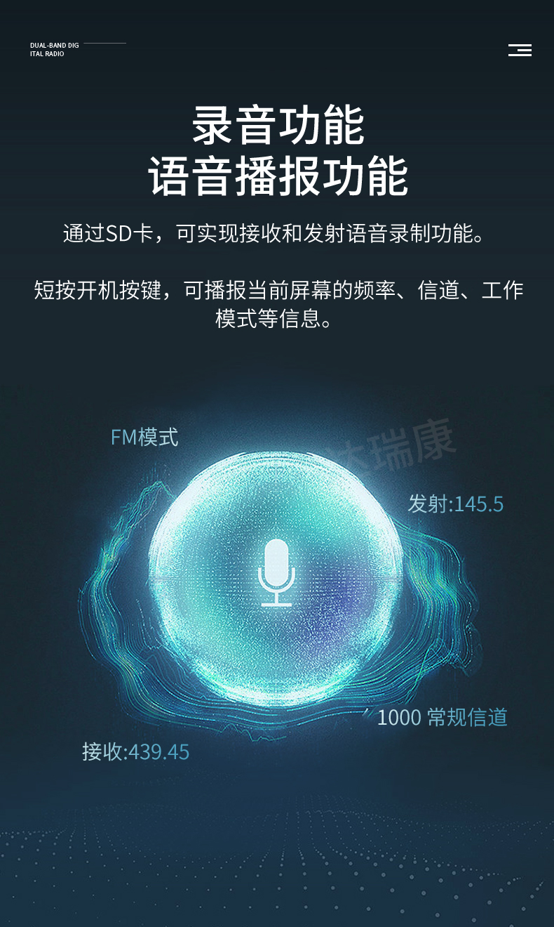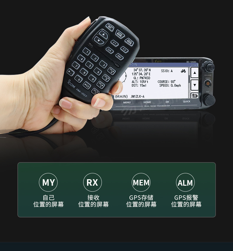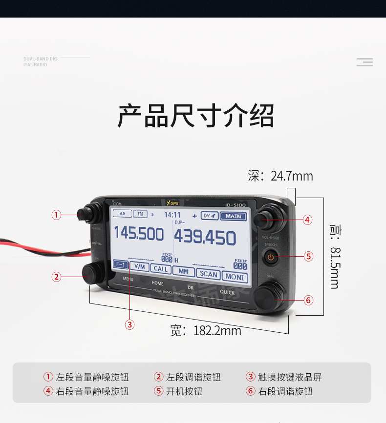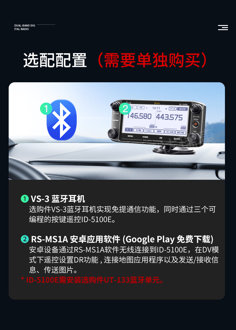 數模業余雙段車臺 5.5英寸觸摸屏操作,可同時接收FM/FM 、FM/DV 、DV/DV模式兩個頻道,雙段雙顯雙守候,內置GPS接收機,DV/FM中繼臺列表功能,語音和數據存SD卡槽,可選配藍牙耳機,50W大功率輸出 業余愛好者常用款 核準代碼CMIIT ID: 2015FJ0386