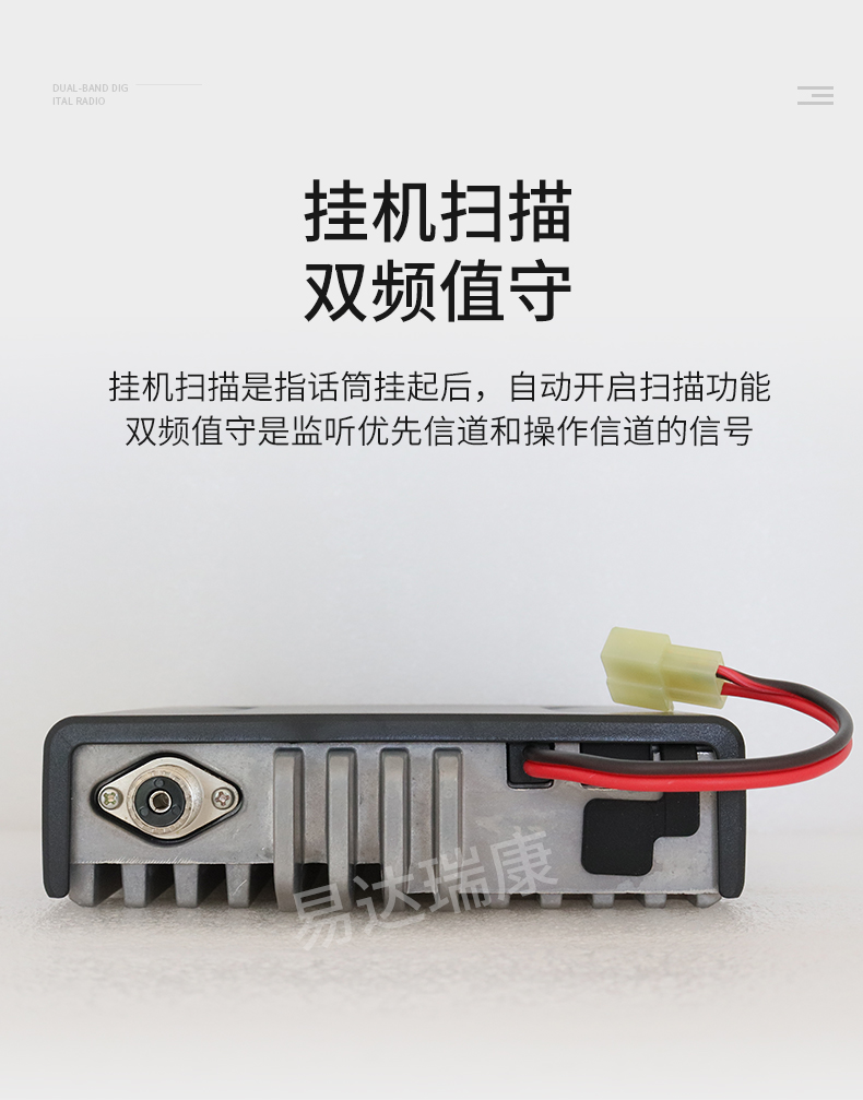 掛機掃描和雙重回望查看功能  雙重回望查看是在優先頻道和操作頻道之間查看,掛機掃描功能是指車臺手咪掛到掛鉤上面后,主機自動開啟掃描功能,掃描停止在優先頻道或者當先顯示的頻道,(需要預先編程)。
